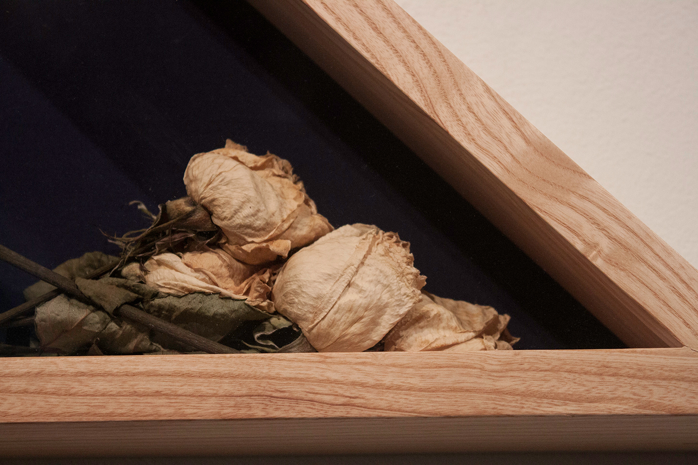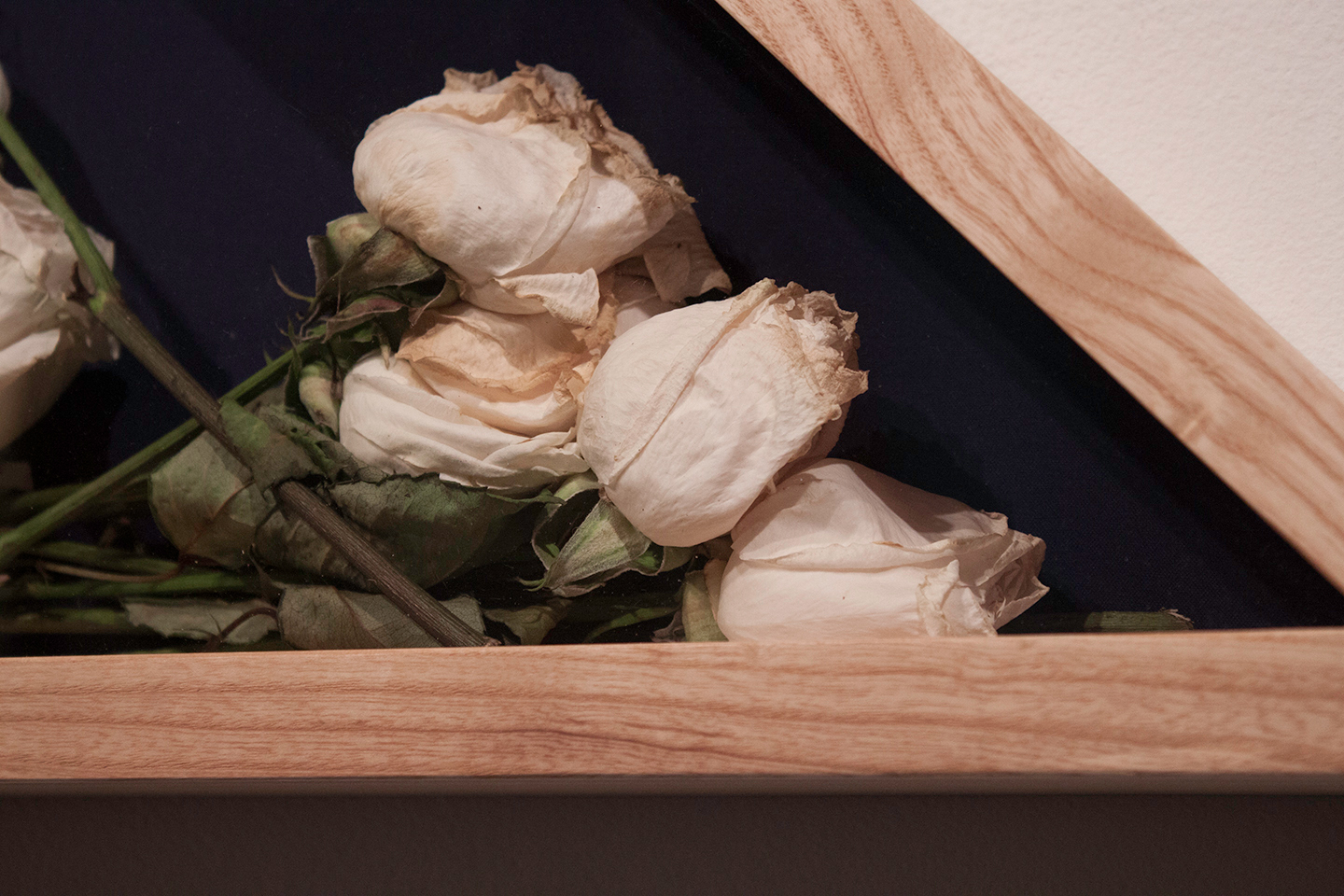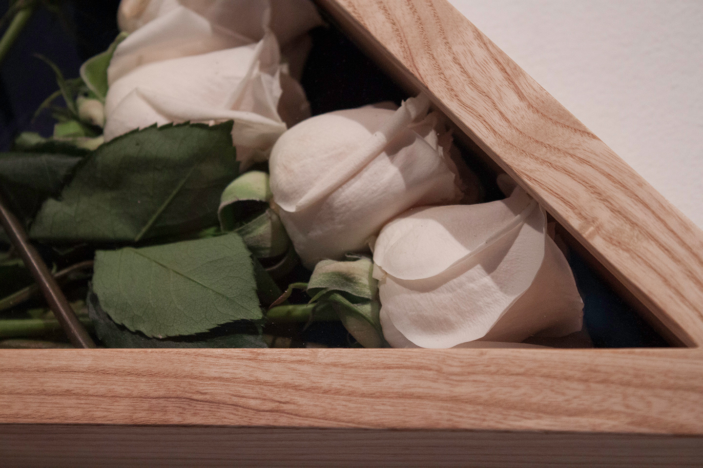 This arrangement of thirteen white rose stems crowded into an Ash flag display is a lament of the persistence of suffering and the finality of corporeal sacrifice.